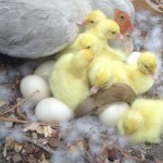 Baby bandicoot spotted curled up with a mother duck in a nest along with her ducklings