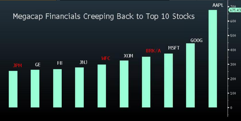 With Berkshire Hathaway Inc. fourth and Wells Fargo & Co. sixth, financial stocks now hold three spots, the most since 2006, data compiled by Bloomberg show.